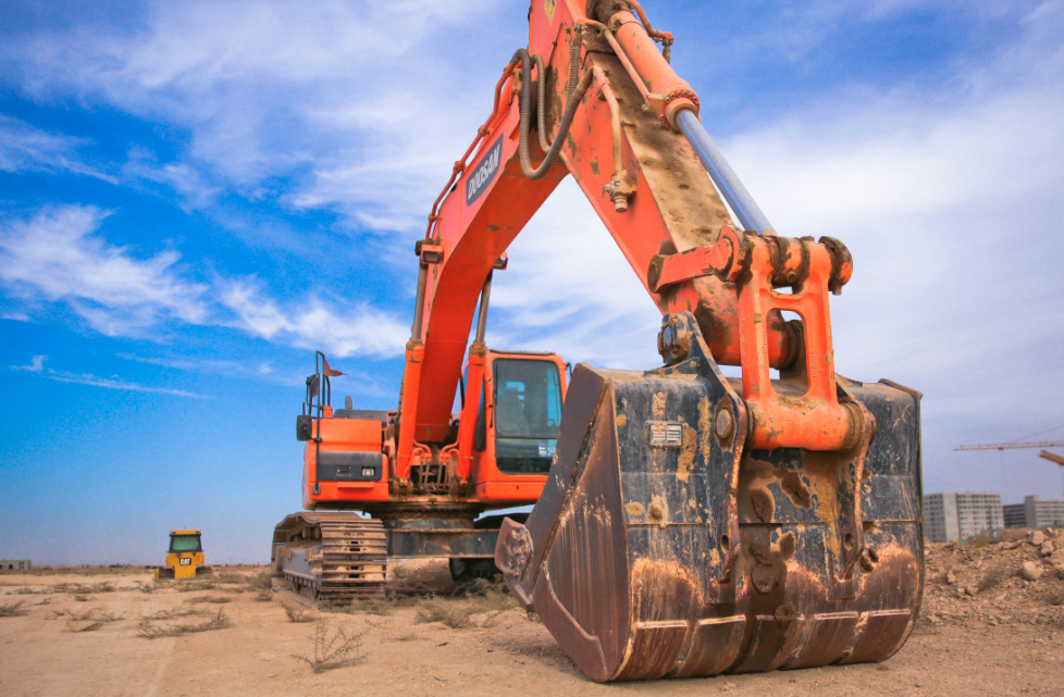 橙色挖掘机在白云下